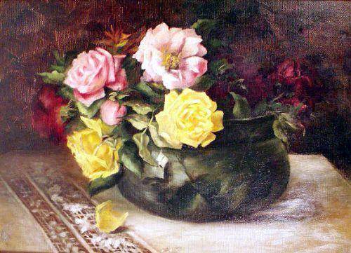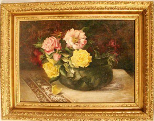 Depicting a floral still life, appears to be unsigned. Some losses and possible re-touches. 15 1/2"h x 21 1/2"w.