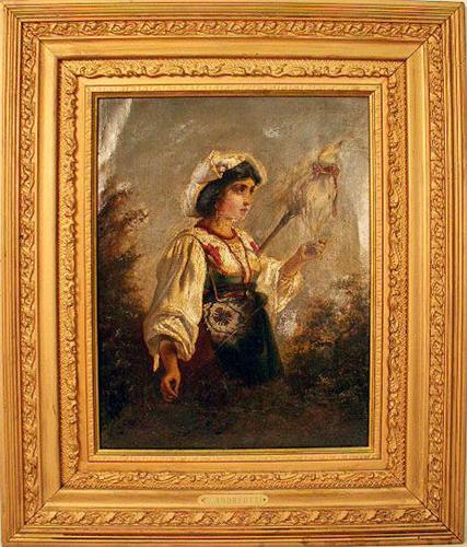 Depicting a woman holding a string, the canvas appears to be unsigned, the frame bears plaque "F. Andreotti" (Federico Andreotti, Italian, 1847-1930), the verso of stretcher also incised "F. Andreotti". Re-lined and some discoloration. 17 1/2"h x 13 1