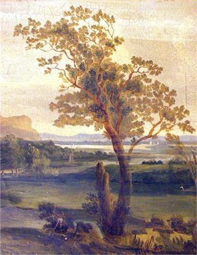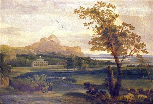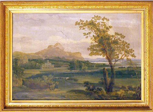 Depicting a bucolic Hudson River estate, attributed to Thomas Thompson (American, 1776-1862), founder of the Brooklyn Museum of Art, unsigned. Provenance: Purchased from the artist by consignor`s great-great grandfather. Tears and losses. 14"h x 21"