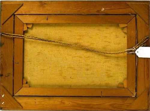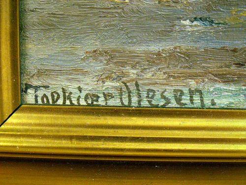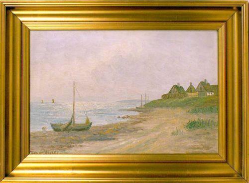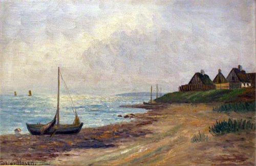 Depicting a coastal seascape with fishing village, bears signature l.l. Topkier Olesen, Sightline: 11 3/4"h x 13 1/2"w