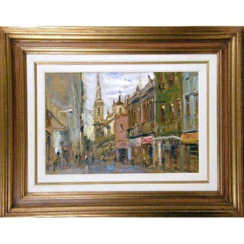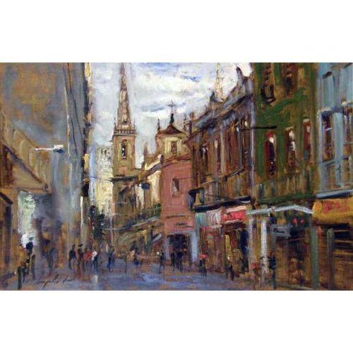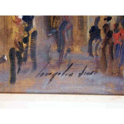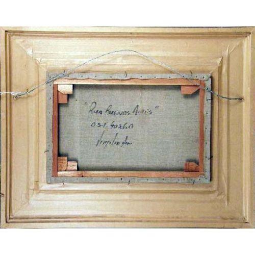 A FRAMED OIL ON CANVAS<BR><BR>Titled "Rua Buenos Aires", bears illegible signature. 15-1/4"h x 23"w