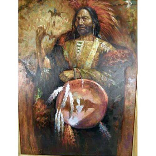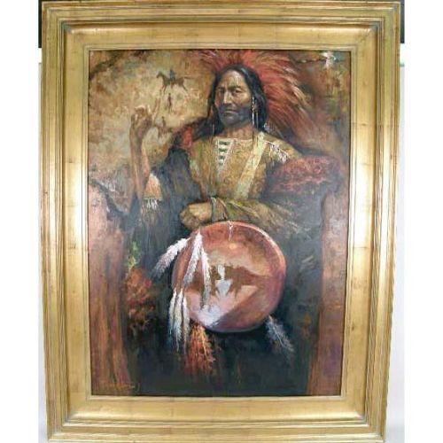 A FRAMED OIL ON CANVAS<BR><BR>Portrait of an Indian chief, bears signature l.l. Troy Denton (Korean-American b. 1949), 39-1/2"high x 29-1/2" sightline