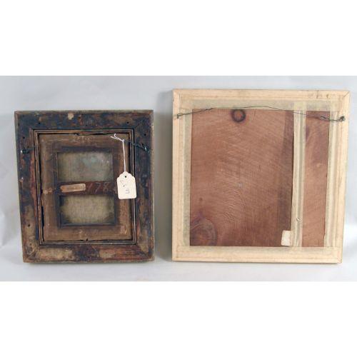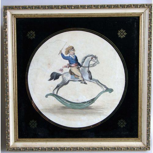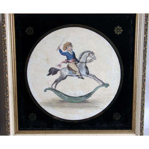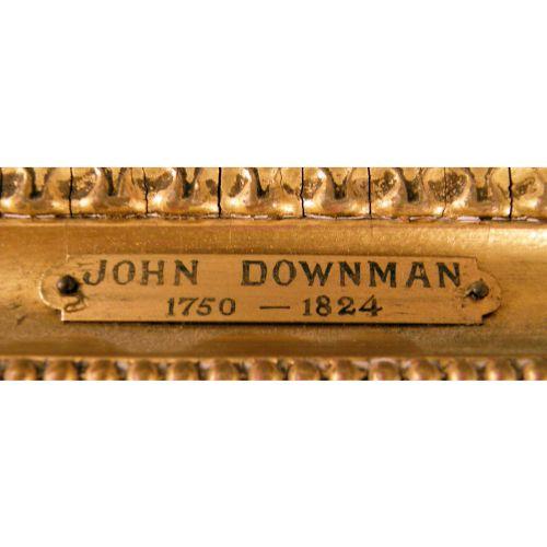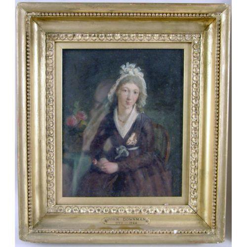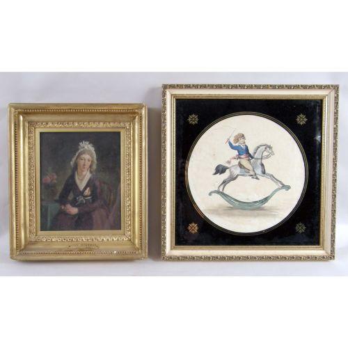 A FRAMED OIL ON CANVAS<BR><BR>Depicting, the portrait of a lady, bears plate on frame, "John Downman," 8"h x 6-1/2"w. Together with a framed watercolor of a boy on a rocking horse, 9-3/4"h x 9-1/4"w