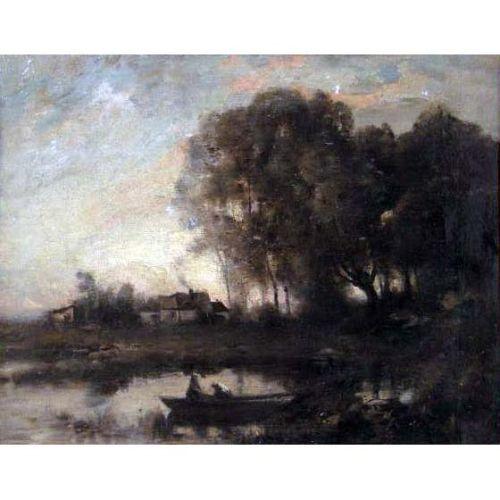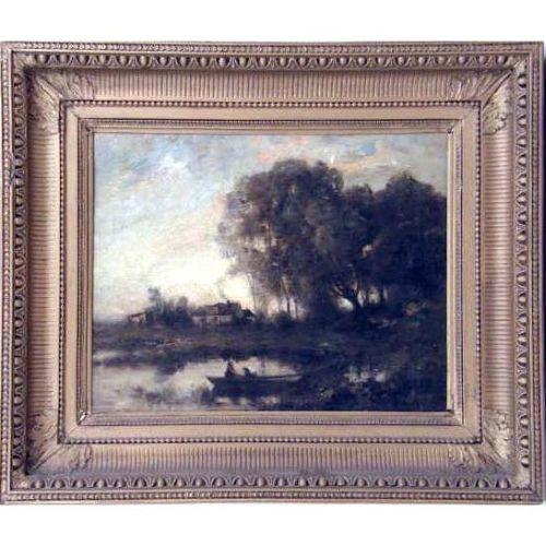 A FRAMED OIL ON CANVAS<BR><BR>Depicting a river scene, losses and craquelure, 13-3/4"h x 17-1/2"w