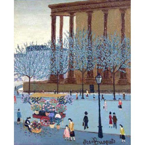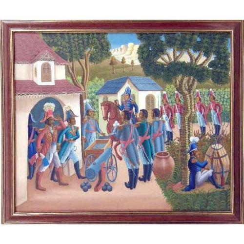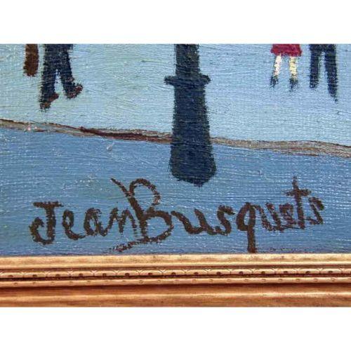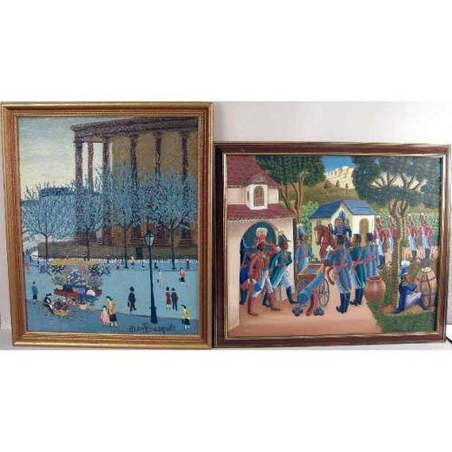 A FRAMED OIL ON CANVAS<BR><BR>Depicting a street scene, bears signature Jean Busquets, losses and stains, 24"h x 13"w. Together with a framed oil on canvas, depicting a military scene, 19-1/2"h x 23-1/2"w