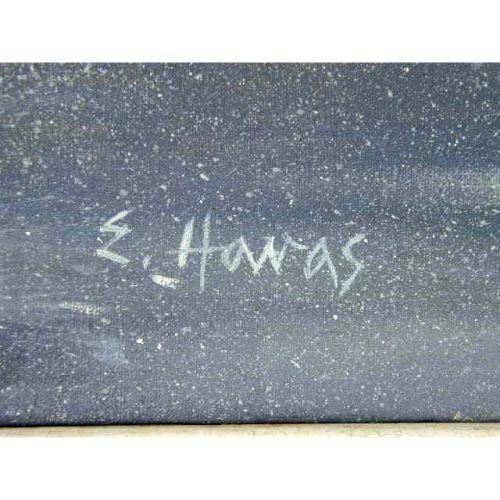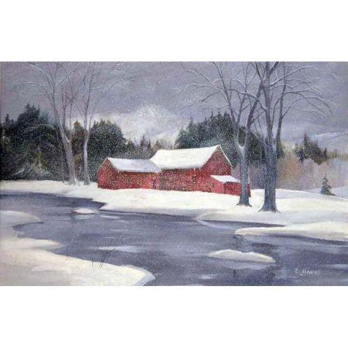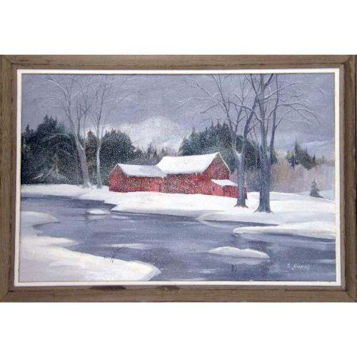 A FRAMED OIL ON CANVAS<BR><BR>Depicting winter landscape with a red barn, bears signature, Edith Howas, 23-1/2"h x 35-1/2"w