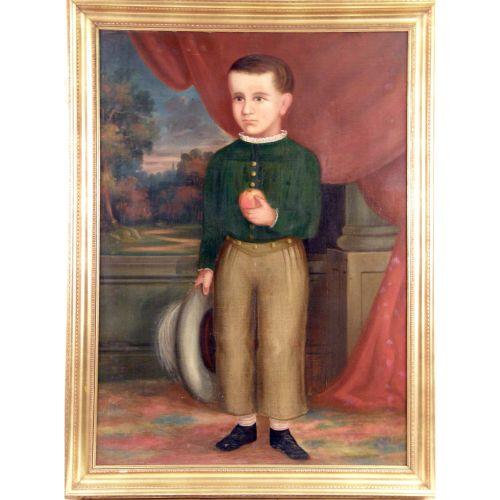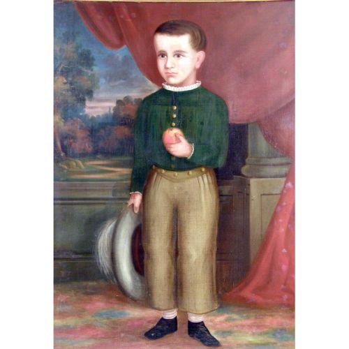 A FRAMED OIL ON CANVAS<BR><BR>An early 19th century primitive portrait of a child holding a peach, unsigned, 41-1/2"h x 29"w