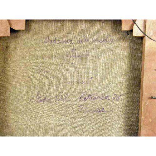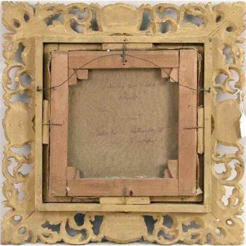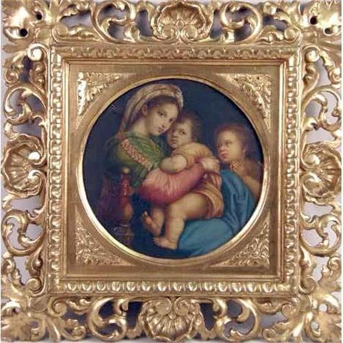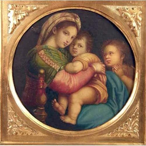 A FRAMED OIL ON CANVAS<BR><BR>Old Master style painting, of Madonna and two children, on back of canvas "Madonna della Sedia di Rafello Petrarcor "Firenze",, 9-1/2"dia.
