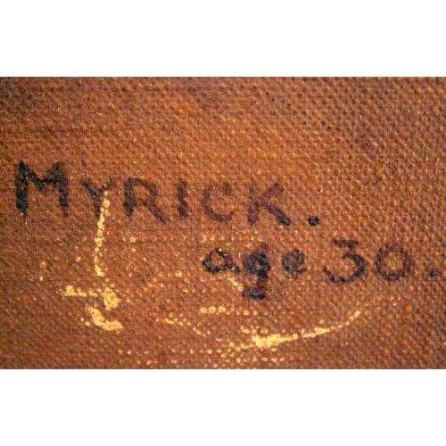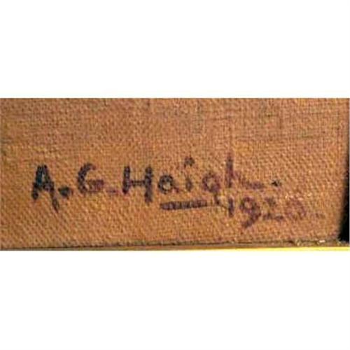 A FRAMED OIL ON CANVAS<BR><BR>Depicting "Myricle, Age 30", bears signature lr A.G. Haigh, dated 1920, the verso bears a gallery label from Arthur Ackerman & Son, Inc. (New York). Some surface scratches. 17 1/2"h x 19 1/2"w.