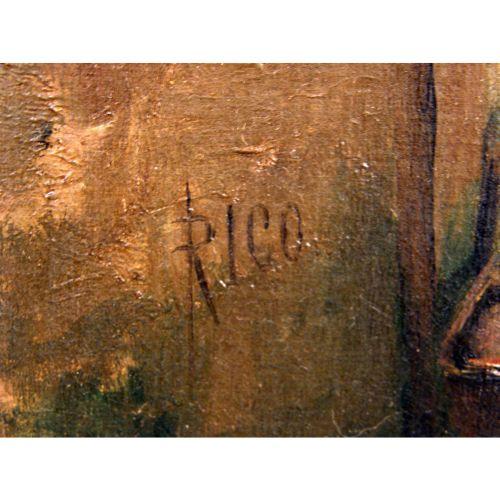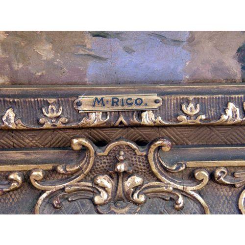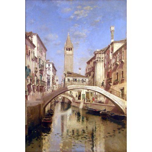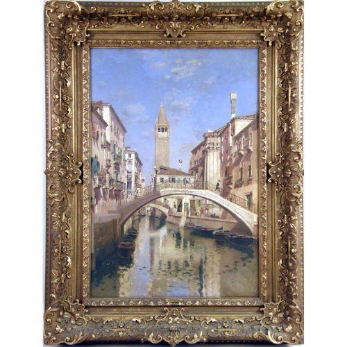 A FRAMED OIL ON CANVAS<BR><BR>Of a Venetian canal scene, with buildings, bridges, and St. Marks` Square bell tower in the distance, signed Rico (Martin Rico Ortega, Spanish, 1833-1908, 27"h x 18-1/4"w