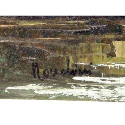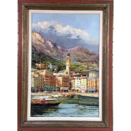 A FRAMED OIL ON CANVAS<BR><BR>Of a landscape of Tyrolean or a Northern Italian town, at waters edge with mountains in background, signed indistinctly, 35"h x 23"w