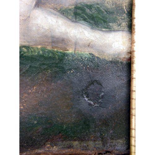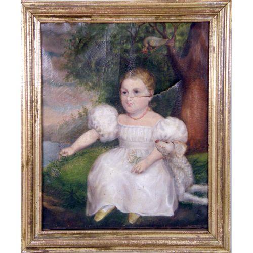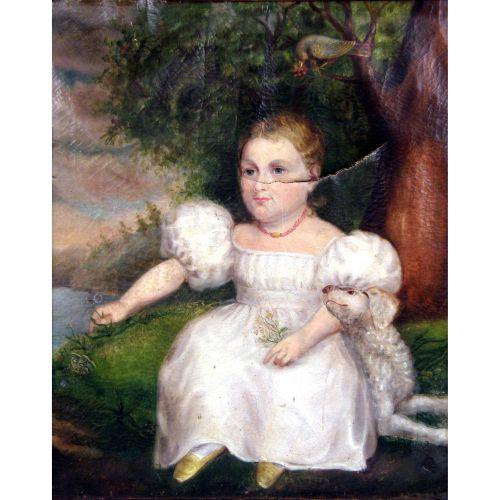 A FRAMED OIL ON CANVAS<BR><BR>American School, portrait of a girl with her dog and bird, losses, tear, 29"h x 23"w