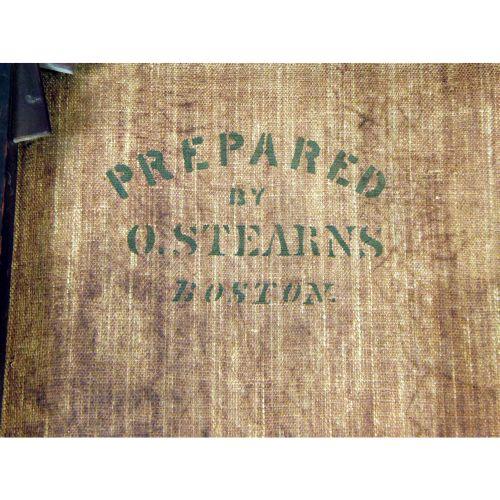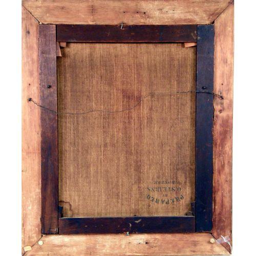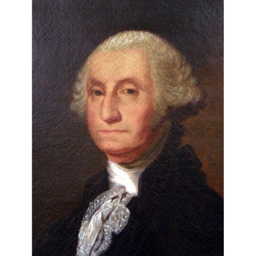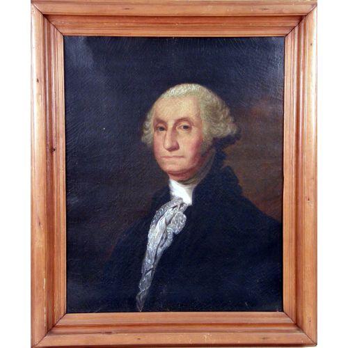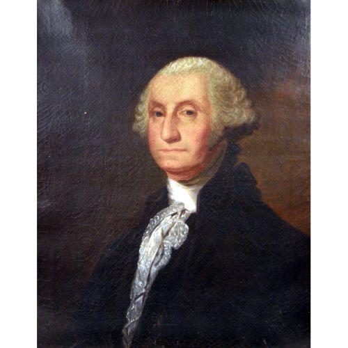 A FRAMED OIL ON CANVAS<BR><BR>American School, portrait of George Washington with white collar, on verso, bears stencil on canvas, "Prepared by O. Stearns, Boston", losses, 29"h x 23"w
