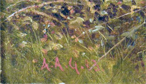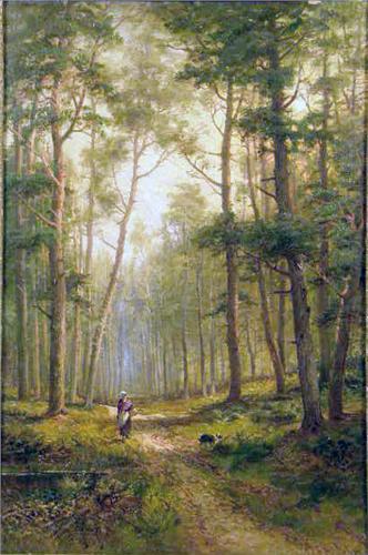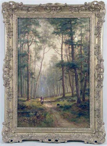 Of a girl and a dog in a wooded landscape, unsigned, attributed to Alfred Augustus Glendening (British, 1861-1907). 23"h x 15 1/2"w
