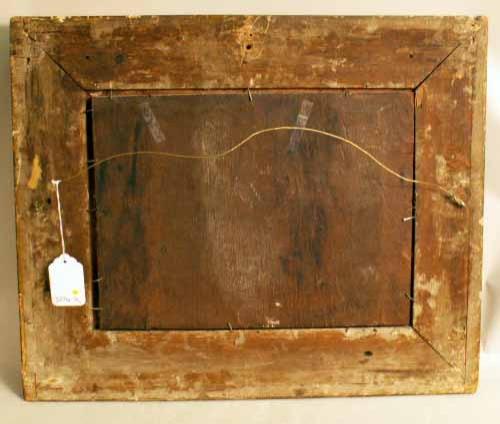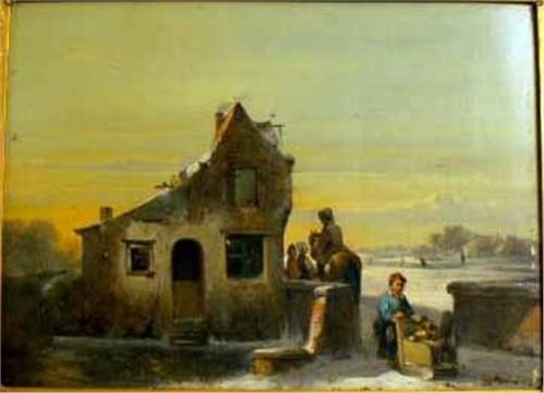 Depicting a European winter genre scene, appears to be unsigned. Minor losses to painting and gilt frame. 11"h x 15 1/4"w.