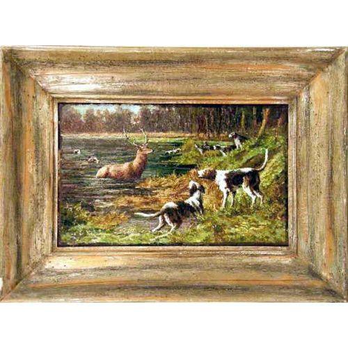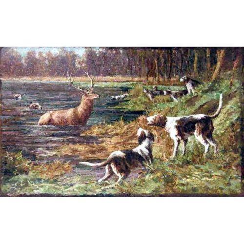 A FRAMED OIL ON SLATE<BR><BR>Depicting, a landscape with a stag at bay, 8-3/4"h x 13-3/4"w