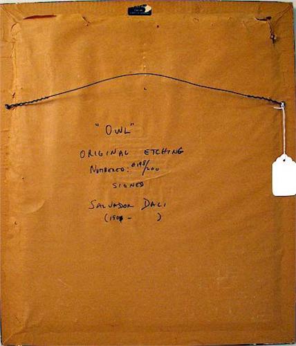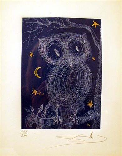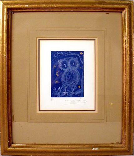 Depicting an owl in a tree, bears signature lr Salvador Dali, and numbered ll 198/200, titled "Owl". 7"h x 4 3/4"w.