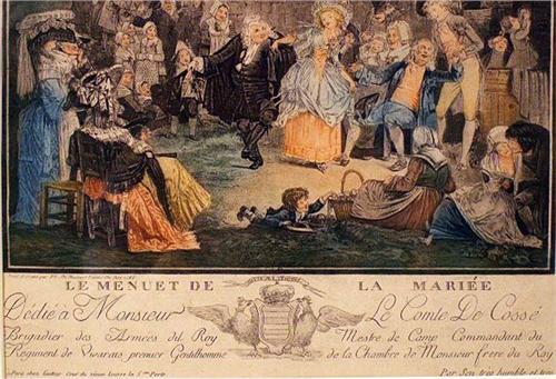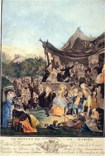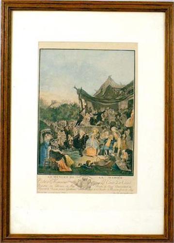Titled "Le Menuet de la Mariee", by Louis-Philibert Debucourt (French, 1755-1832). 13"h x 8 1/2"w. Provenance: William H. Guthman Collection, Connecticut Property from the Estate of William H. Guthman Exhibition: National Gallery of Art, "Colorful Im