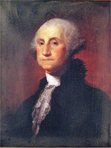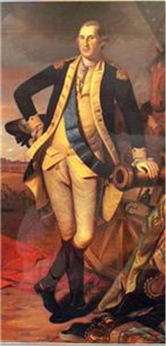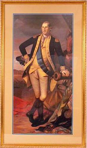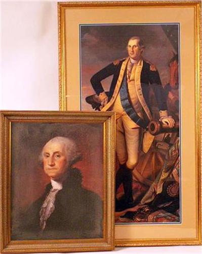 Depicting Gilbert Stuart`s portrait bust of George Washington. Imperfections to surface. Together with a framed print depicting Charles Wilson Peale`s famous full length portrait of General Washington. Sightlines from 19 1/2"h x 15 1/2"w to 34"h x 1