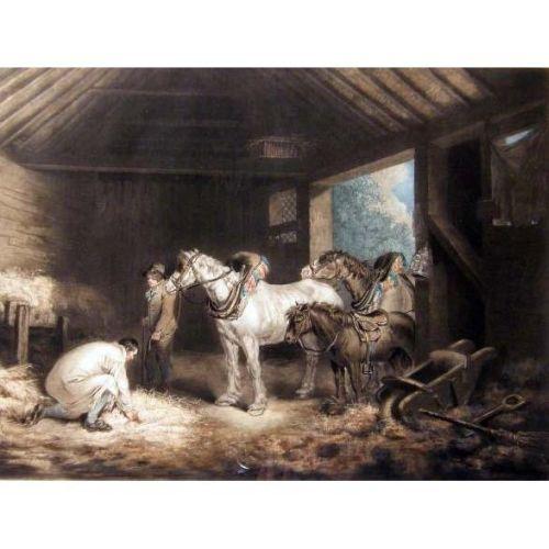 A FRAMED POLYCHROME PRINT<BR><BR>Titled "The Farmer`s Stable," 19-1/2"h x 25"w