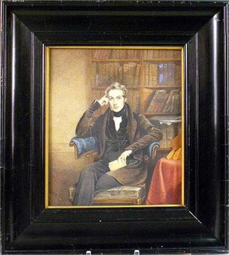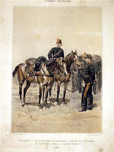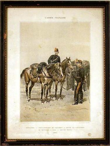 Depicting a gentleman seated in a library. Together with a framed French print titled "L`Armee Francaise". Wear. From 8"h x 7"w to 16 1/2"h x 11 1/2"w. 2 pieces.