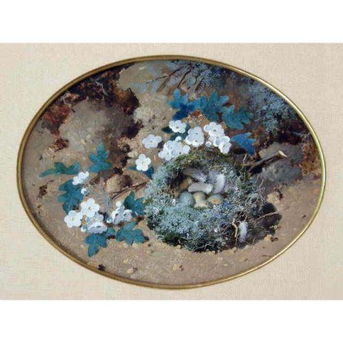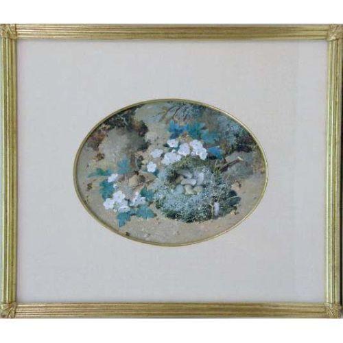 A FRAMED PRINT<BR><BR>Still life of a bird`s nest and white flowers within an oval mat, 9"l