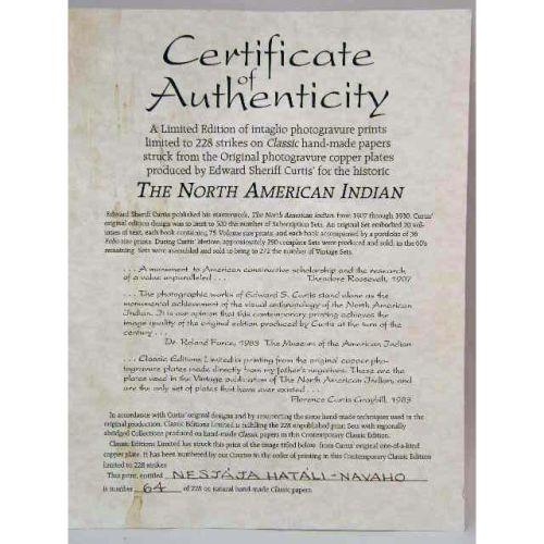 A FRAMED PRINT<BR><BR>Titled "Nesja Ja Hatali-Navaho," #64/228, by Edward Sheriff Curtis, sightline "15"h x 11"w. Together with a vintage Abercrombie and Fitch photograph, 10"h x 13-1/2"w