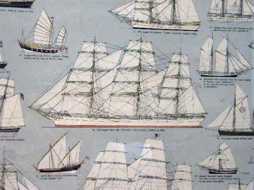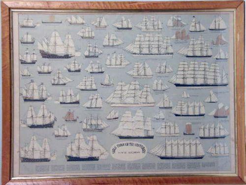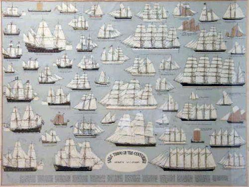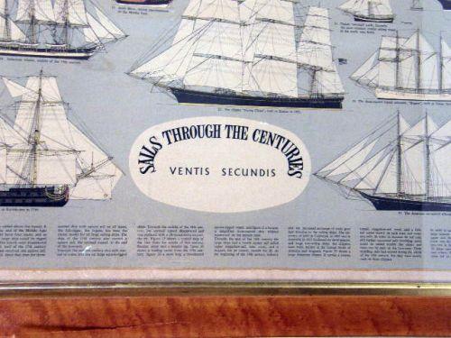 <B>A FRAMED SAILING SHIP POSTER</B><BR><BR>Sails through the Centuries/Ventis Secundis. 29"h x 39"w Losses to frame, sun-bleached.