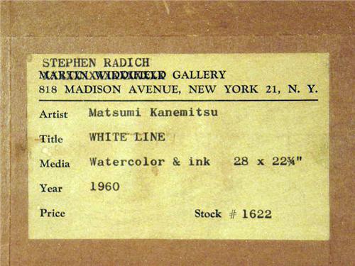 Signed l.l.c. and dated "60" (Matsumi Kanemitsu, Japanese, b.1922). With a Stephan Radich Gallery on paper label verso notes, "Matsumi Kanemitsu, White Line 1960". 28 1/2"h x 22"w