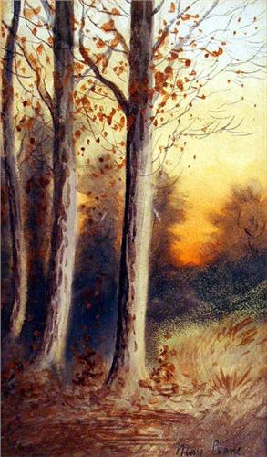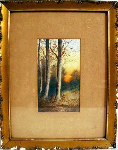 Depicting an autumnal forestscape at sunset, bears signature lr Mary Crane. 7 3/4"h x 4 1/2"w.