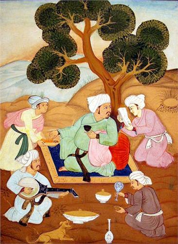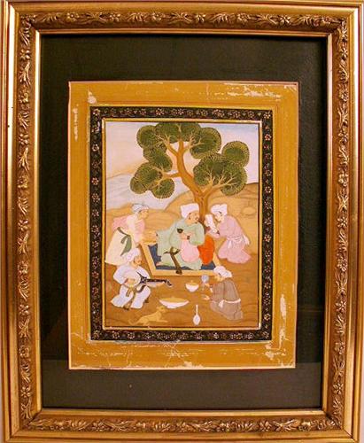 Indian, depicting men and women. Losses, fold marks, and wear. 9 1/2"h x 7 1/2"w.
