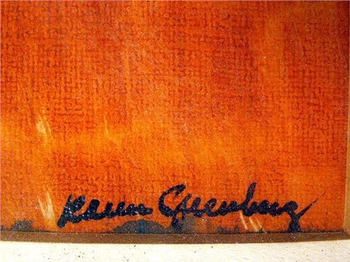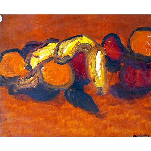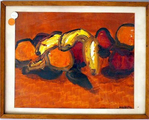 Abstract fruit still life, bears signature K...Greenberg. Losses to frame. 10 1/2"h x 13"w.