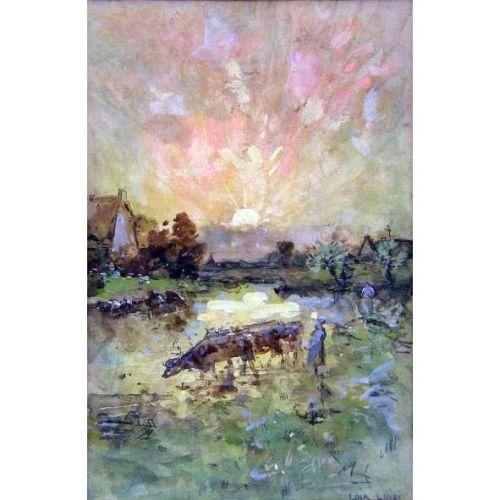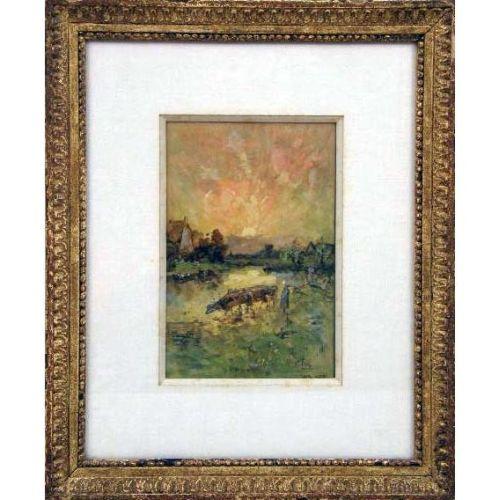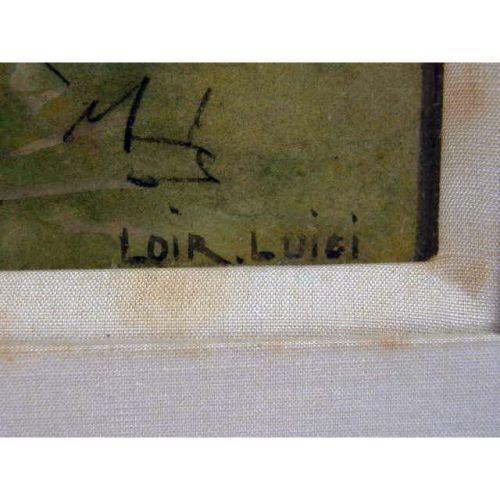 A FRAMED WATERCOLOR<BR><BR>Depicting a barnyard scene with figures, bears signature l.r. Loir Luigi, losses and stains, 9"h x 6"w