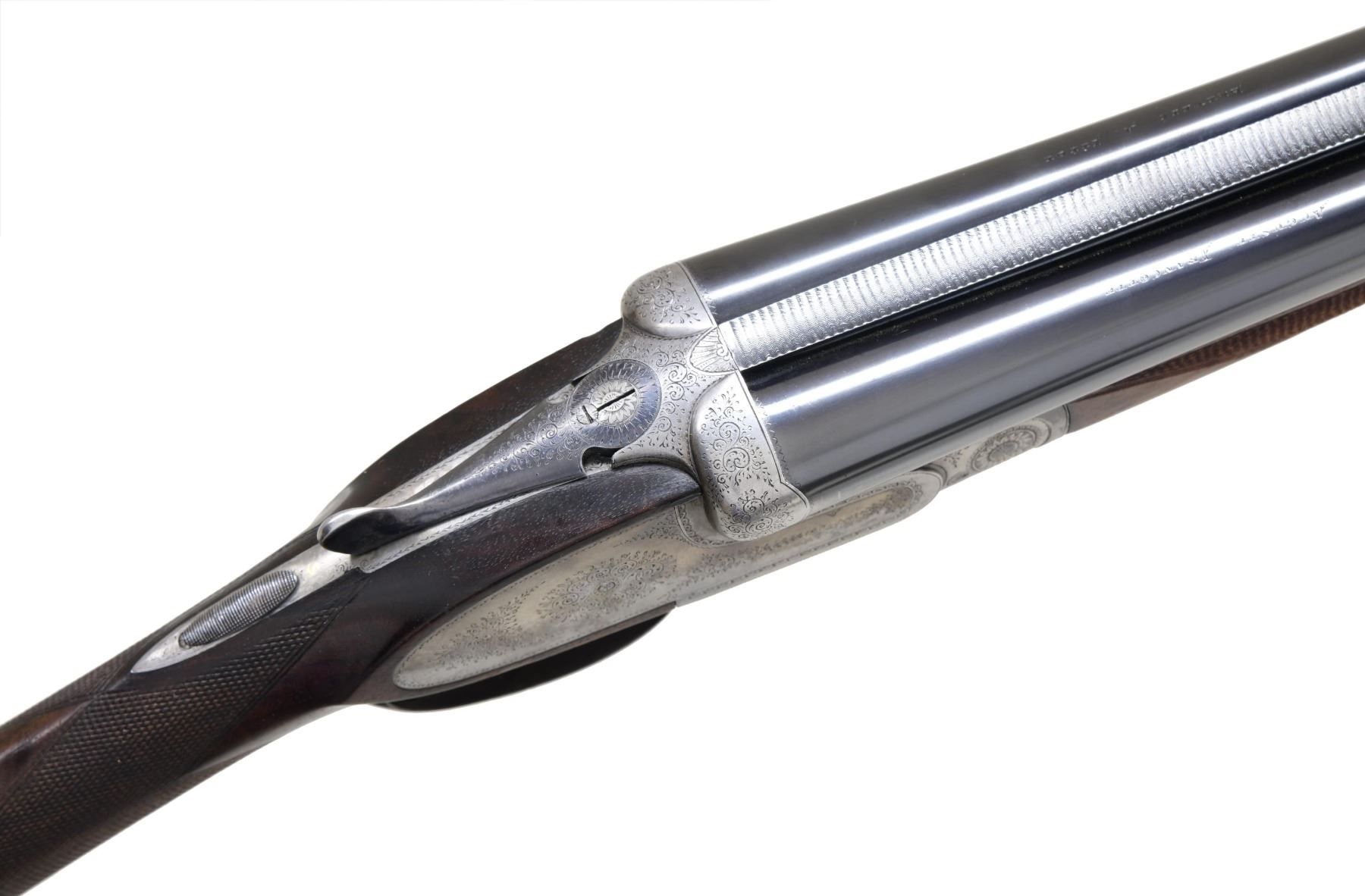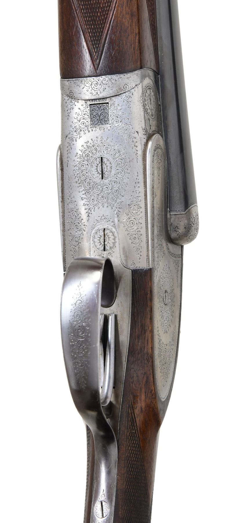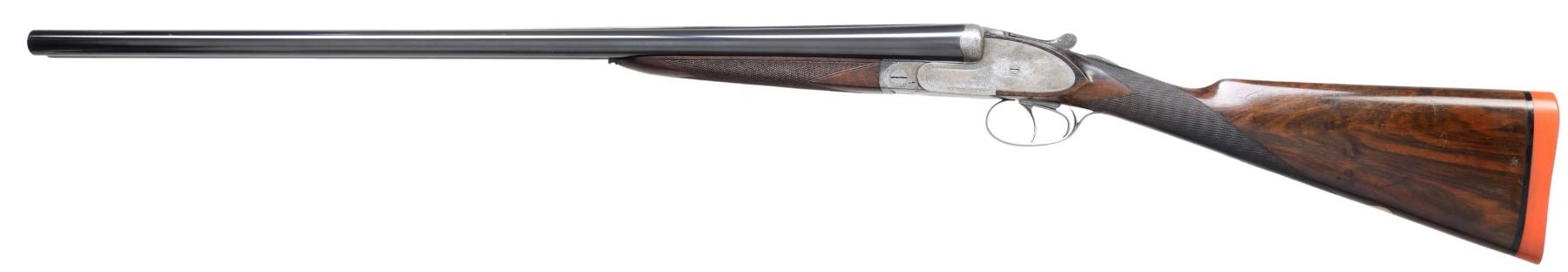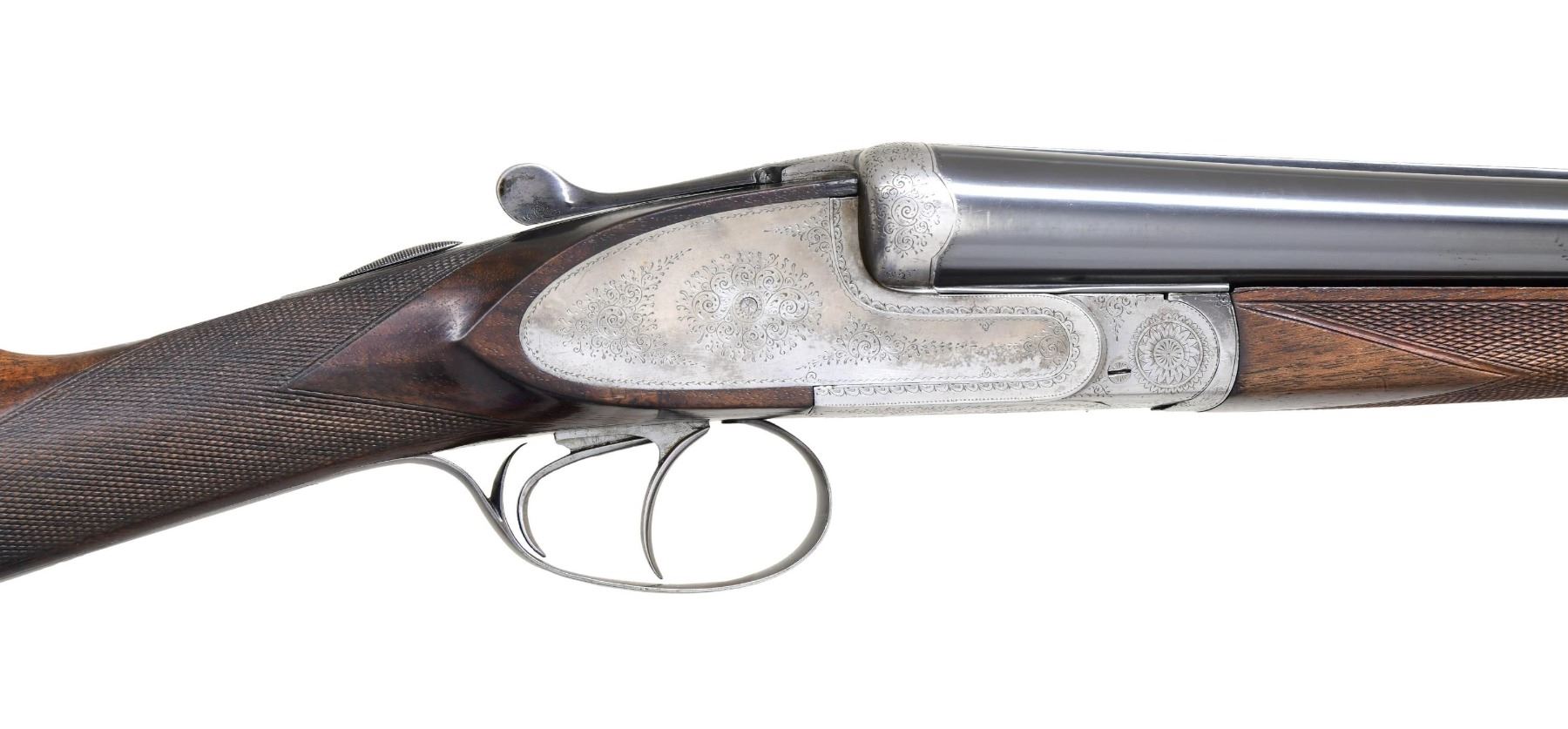 GAME GUN WITH EXTRA BARRELS & CASE. Cal. 12 Ga. 2-3/4" (BOTH). S# 79347. Two barrel sets; one 27", the other 28". Each have matching semi-raised matted game ribs with "Auguste Francotte" "Brevete A Liege" engraved on tops. 28" barrels do not have a date code and are stamped with Belgian nitro proofs for 2-1/2" chambers. Crowned "AF" marks are present on flats. 27" barrels are stamped for 2-3/4" chambers and with 1925 date code. "AF" marks are not present. Coin finish sideplated boxlock action features automatic safety, Purdey type hidden third fastener, side clips and double triggers. Action is engraved with about 70% coverage varying sized simple scroll. No maker's name is present. Straight grip buttstock of well marbled and lightly figured European walnut measures 14-5/8" over Silver type pad. Closely spaced point pattern checkering is at grip and a vacant silver oval is on toeline. Splinter ejector forend has Anson release and checkering pattern does not match buttstock. MEASUREMENTS: BBLS: 28" Bore Diameter: L .725. R .726. Restriction: L .030 (full). R .021 (mod). Wall thickness: L .031. R. .031. STOCK: DAH: 2". DAC: 1-9/16". CAST: slightly off. LOP: 14-5/8". WEIGHT: 6 lb. 11 oz. MEASUREMENTS: BBLS: 27" Bore Diameter: L .727. R .726. Restriction: L .009 (IC). R .003 (IC). Wall thickness: L .030. R .031. STOCK: DAH: 2-1/16". DAC: 1-9/16". CAST: slightly off. LOP: 14-5/8". WEIGHT: 6 lb. 6 oz. UNATTACHED ACCESSORIES: gun and both barrel sets are housed in a vintage leather case with brass corners lined in green cloth. Case contains a pair of snap caps. CONDITION: good to fine as partially refinished. Both barrel sets retaining about 90% of a good quality but not matching re-blue. Action retains most of its French gray which shows light cleaning. Buttstock retains what appears to be its original finish with a fair number of marks and scratches. Wood of forend appears to have been replaced, workmanship is quite good, checkering pattern does not match. Sling loops are removed from barrels, holes plugged. A plugged hole is also on toeline. All bores are bright and shiny without any noted problems. 28" barrel chambers lengthened. Action is tight with both barrel sets. Ejectors are strong and in time. Case is good, with many bumps and marks. Interior cloth is soiled and has some panels replaced. Handle is detached and inside case. (24-4032/MGM). CURIO. $2,500-4,000.