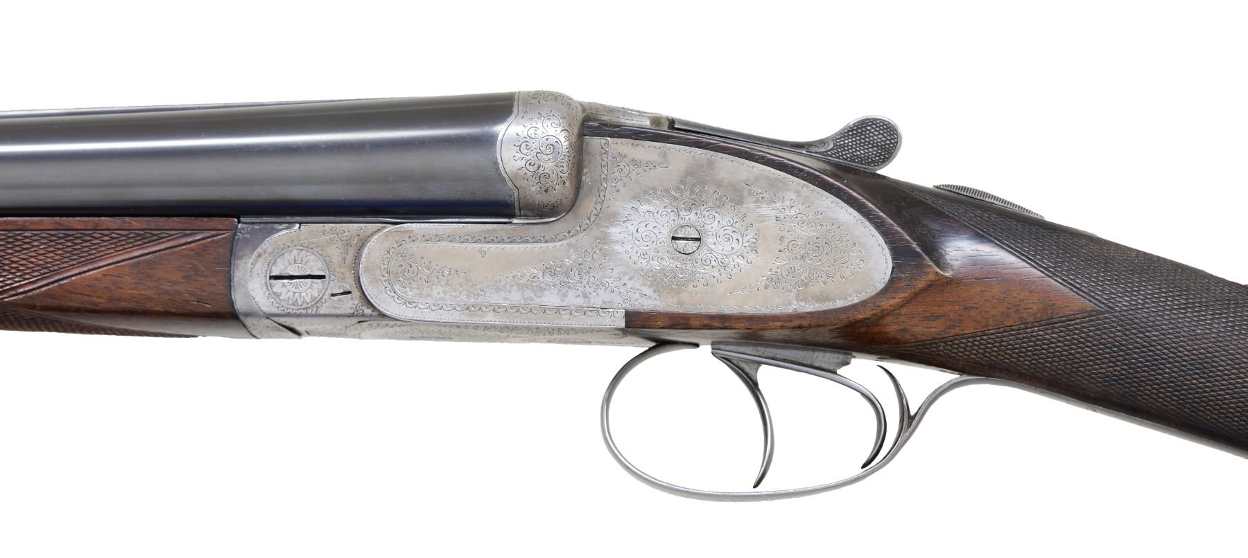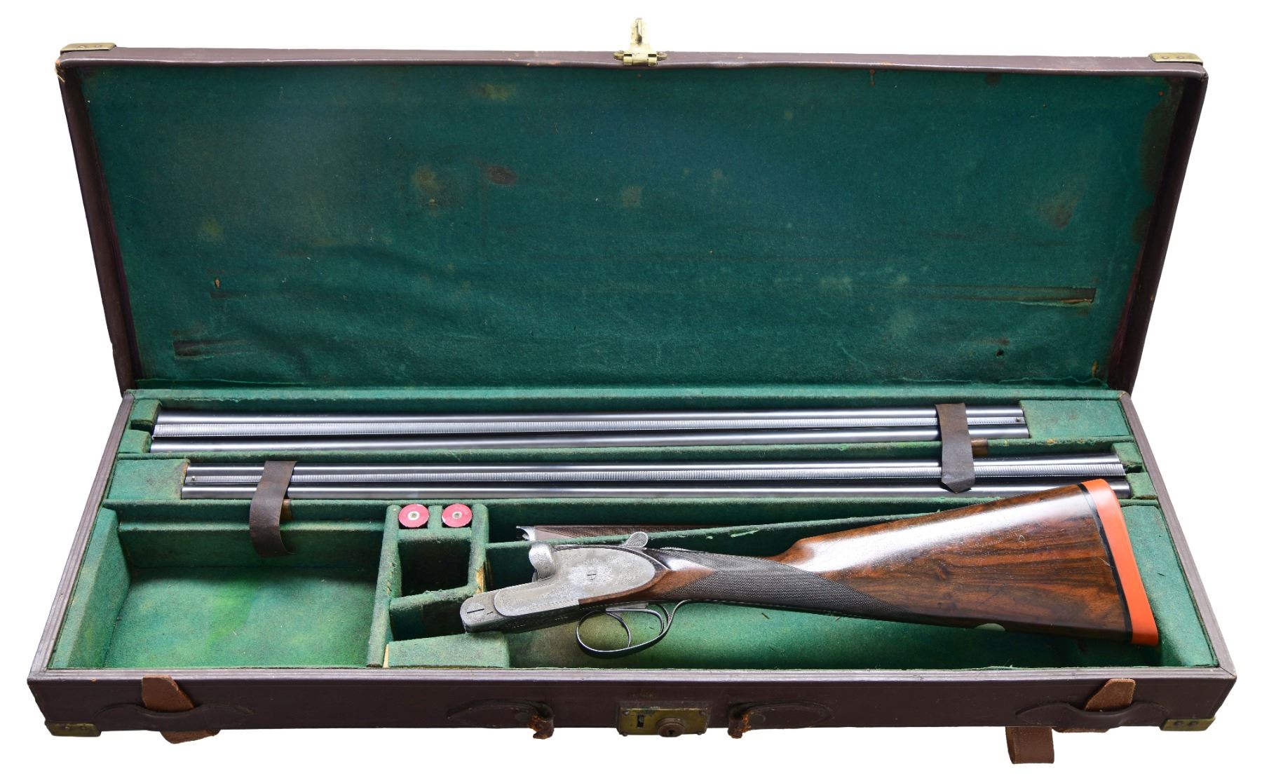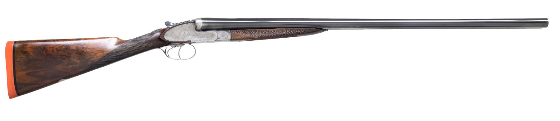 GAME GUN WITH EXTRA BARRELS & CASE. Cal. 12 Ga. 2-3/4" (BOTH). S# 79347. Two barrel sets; one 27", the other 28". Each have matching semi-raised matted game ribs with "Auguste Francotte" "Brevete A Liege" engraved on tops. 28" barrels do not have a date code and are stamped with Belgian nitro proofs for 2-1/2" chambers. Crowned "AF" marks are present on flats. 27" barrels are stamped for 2-3/4" chambers and with 1925 date code. "AF" marks are not present. Coin finish sideplated boxlock action features automatic safety, Purdey type hidden third fastener, side clips and double triggers. Action is engraved with about 70% coverage varying sized simple scroll. No maker's name is present. Straight grip buttstock of well marbled and lightly figured European walnut measures 14-5/8" over Silver type pad. Closely spaced point pattern checkering is at grip and a vacant silver oval is on toeline. Splinter ejector forend has Anson release and checkering pattern does not match buttstock. MEASUREMENTS: BBLS: 28" Bore Diameter: L .725. R .726. Restriction: L .030 (full). R .021 (mod). Wall thickness: L .031. R. .031. STOCK: DAH: 2". DAC: 1-9/16". CAST: slightly off. LOP: 14-5/8". WEIGHT: 6 lb. 11 oz. MEASUREMENTS: BBLS: 27" Bore Diameter: L .727. R .726. Restriction: L .009 (IC). R .003 (IC). Wall thickness: L .030. R .031. STOCK: DAH: 2-1/16". DAC: 1-9/16". CAST: slightly off. LOP: 14-5/8". WEIGHT: 6 lb. 6 oz. UNATTACHED ACCESSORIES: gun and both barrel sets are housed in a vintage leather case with brass corners lined in green cloth. Case contains a pair of snap caps. CONDITION: good to fine as partially refinished. Both barrel sets retaining about 90% of a good quality but not matching re-blue. Action retains most of its French gray which shows light cleaning. Buttstock retains what appears to be its original finish with a fair number of marks and scratches. Wood of forend appears to have been replaced, workmanship is quite good, checkering pattern does not match. Sling loops are removed from barrels, holes plugged. A plugged hole is also on toeline. All bores are bright and shiny without any noted problems. 28" barrel chambers lengthened. Action is tight with both barrel sets. Ejectors are strong and in time. Case is good, with many bumps and marks. Interior cloth is soiled and has some panels replaced. Handle is detached and inside case. (24-4032/MGM). CURIO. $2,500-4,000.
