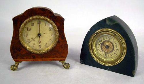 A FRENCH BURLWOOD TABLE CLOCK ON CLAW-AND-BALL FEET; Together with an onyx table clock signed Borostyanko, 1909