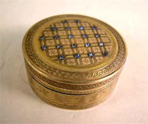 A FRENCH GILT SILVER CIRCULAR COSMETIC BOX; Cross hatch engraved top set with twenty small sapphires, 1-3/4"dia.