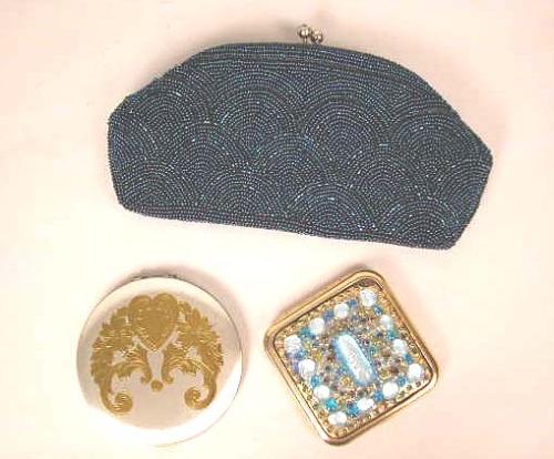 A FRENCH GOLD TONE AND STONE-DECORATED COMPACT; Powder and mirror within, losses 2"h x 2"l Together with a blue beaded purse, 8"l, and a circular compact, 3"diameter, losses