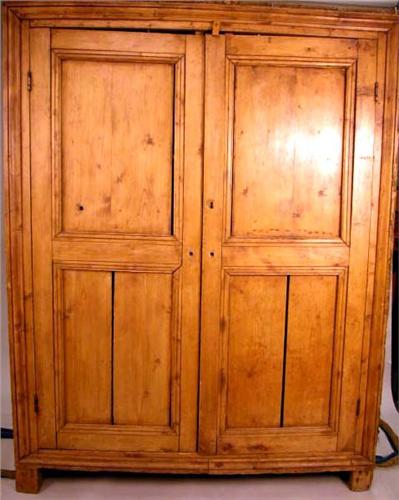 A FRENCH PROVINCIAL PINE WARDROBE; The overhanging cornice above two cupboard doors opening to an interior fitted with shelves and books; 6' 2 1/2"h x 5'w x 24"d