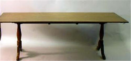 A FRENCH PROVINCIAL STYLE STAINED PINE DINING TABLE; with breadboard ends, two 14 1/2" leaves and slipper feet, some wear. 27 1/2"h x 7'l x 35"w