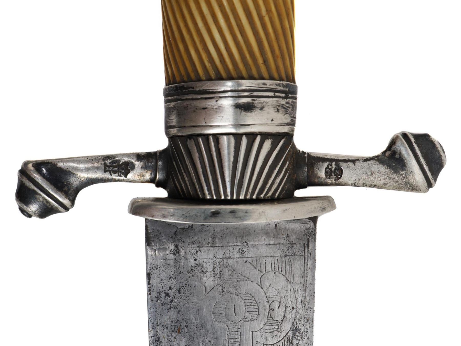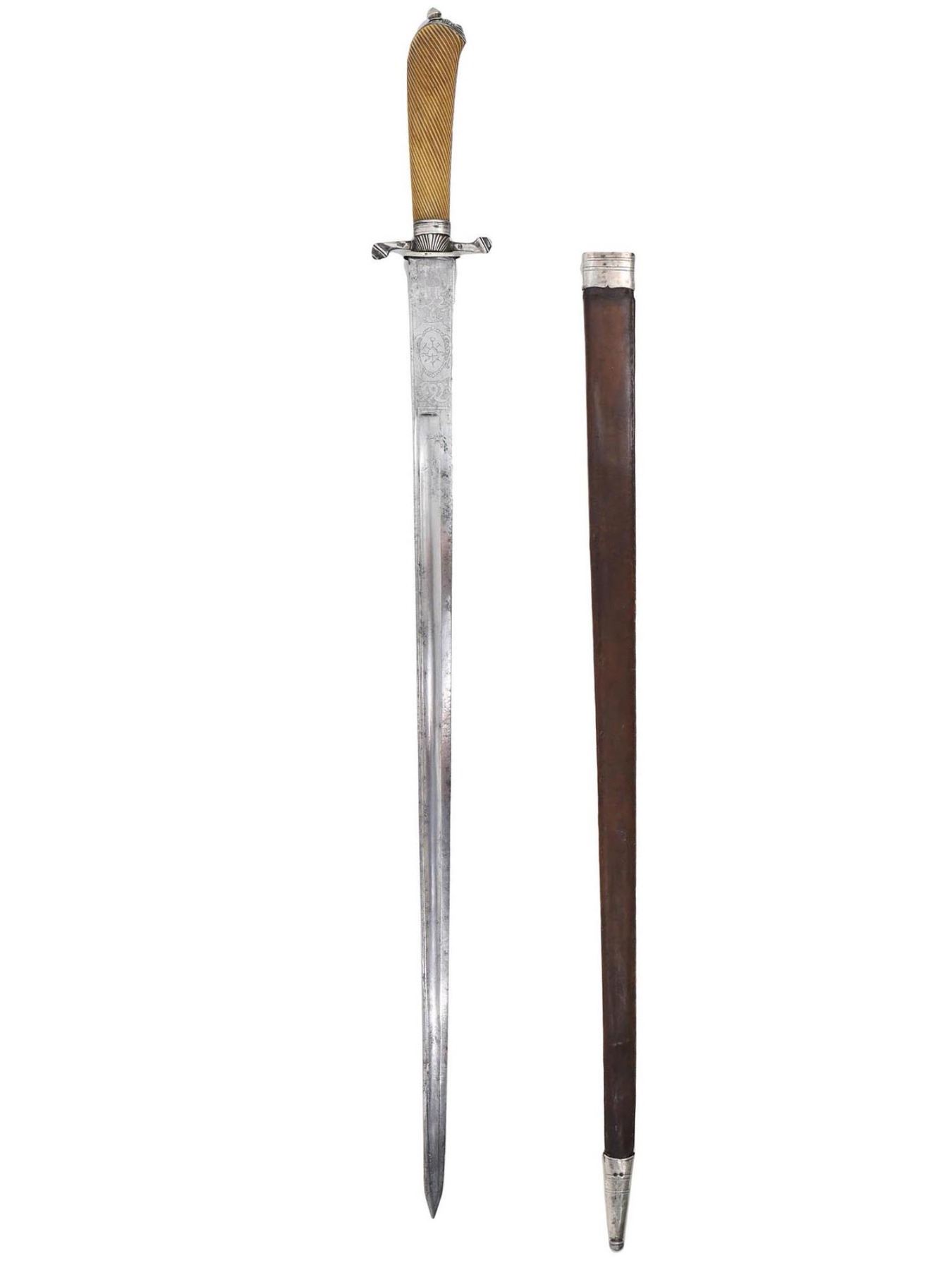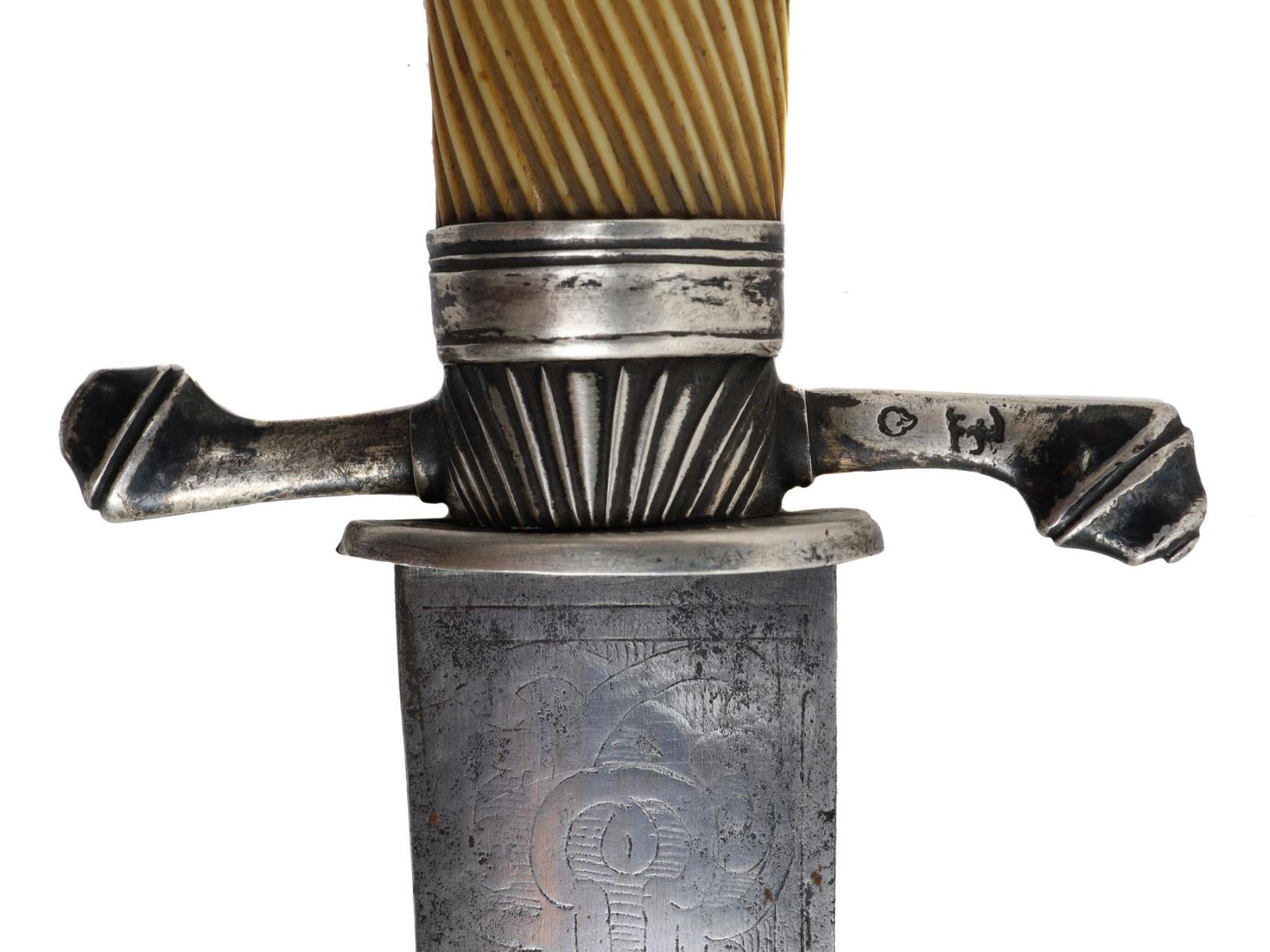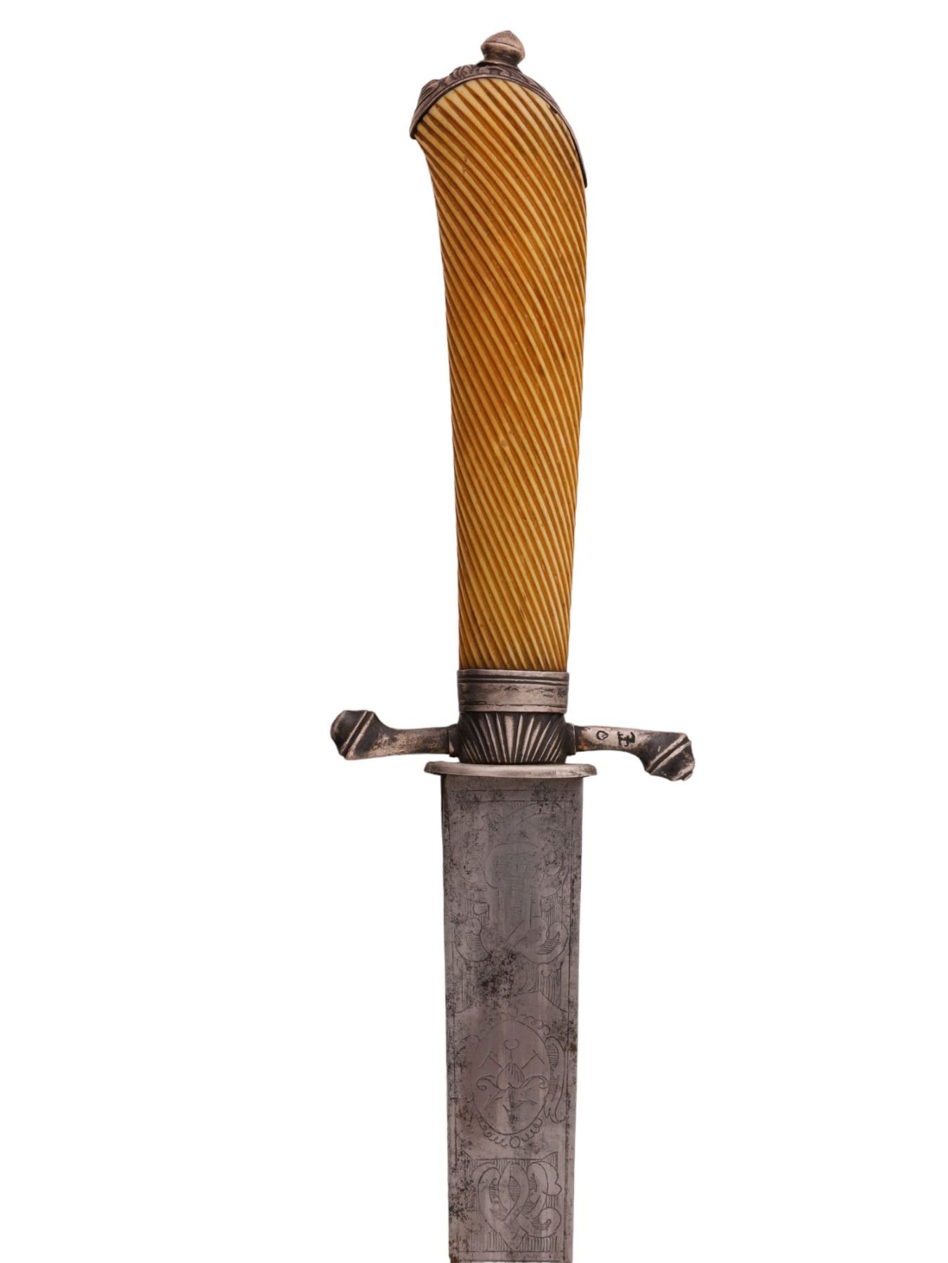 French, late 18th - early 19th-century silver-mounted hunting shortsword with original stitched leather scabbard. A straight pointy blade is decorated with engraving, carved hilt with silver mounts with a mythological face-pommel.