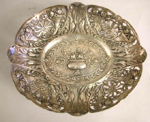A FRENCH SILVER OVAL RETICULATED AND HEAVILY CHASED CENTERPIECE BOWL; With acanthus, stylized floral and cornucopia border around center flower basket, 10"l. apx. 14 T.O.