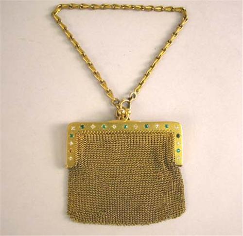 A FRENCH UNMARKED GOLD MESH PURSE WITH DIAMONDS AND EMERALDS SPACED ON FRAME; Each side set with alternating diamonds and emeralds, 20 diamonds and 16 emeralds, missing one