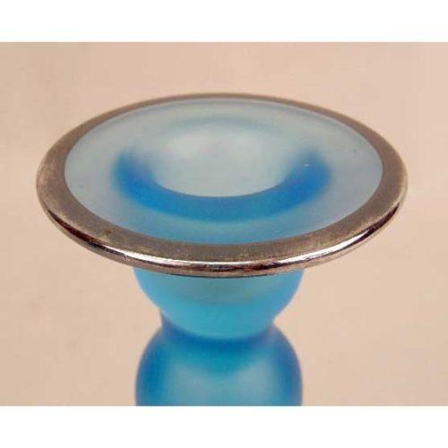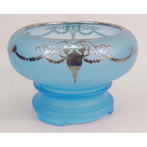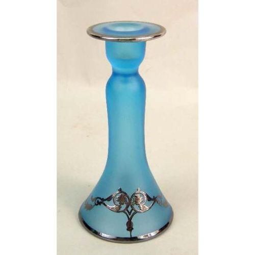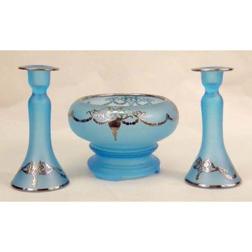 A FROSTED GLASS-AND-SILVER-OVERLAY SERVING BOWL ON STAND WITH TWO MATCHING CANDLESTICKS<BR><BR>the bowl on stand 6 1/2" h x 9 1/2" d. 4 pieces.