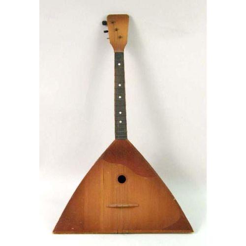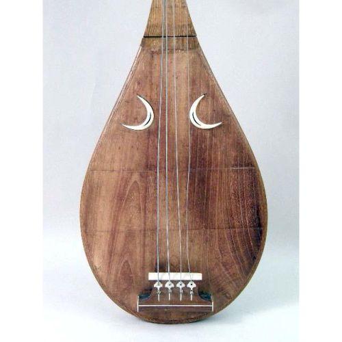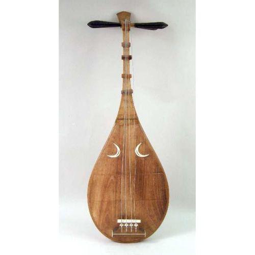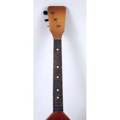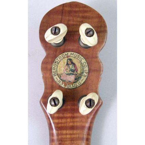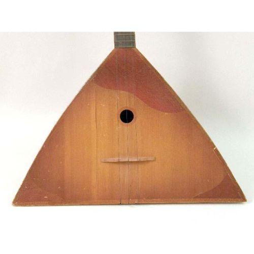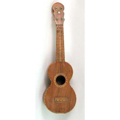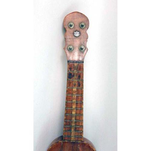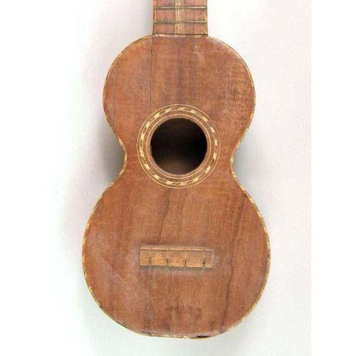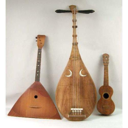 A FRUITWOOD AND EBONY BONE-INLAID EASTERN FOUR-STRINGED LUTE<BR><BR>Together with another wooden stringed instrument, and a ukulele by Bergstrom Music Co. Ltd., Honolulu, losses, missing strings