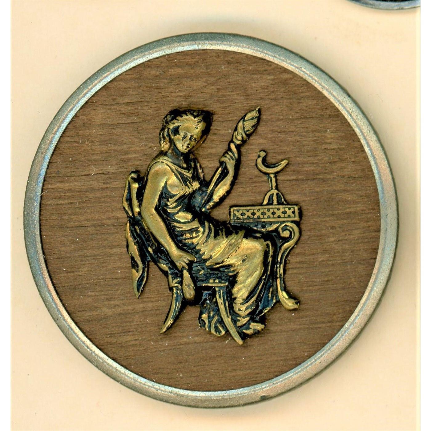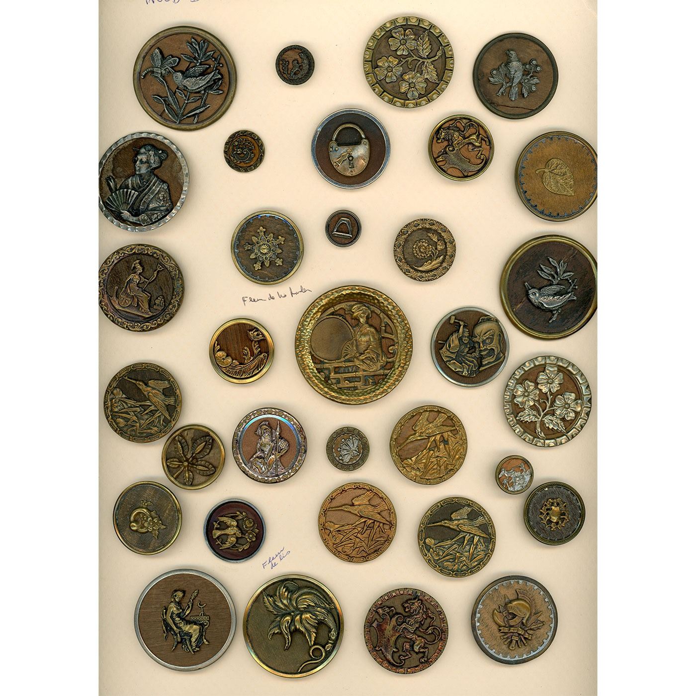 32 Small/Medium/Large 19th C. wood background buttons assorted. This is a card of 19th century wood buttons mostly with metal including brass, steel as well as gutta percha. There are a couple without metal. Nice card.