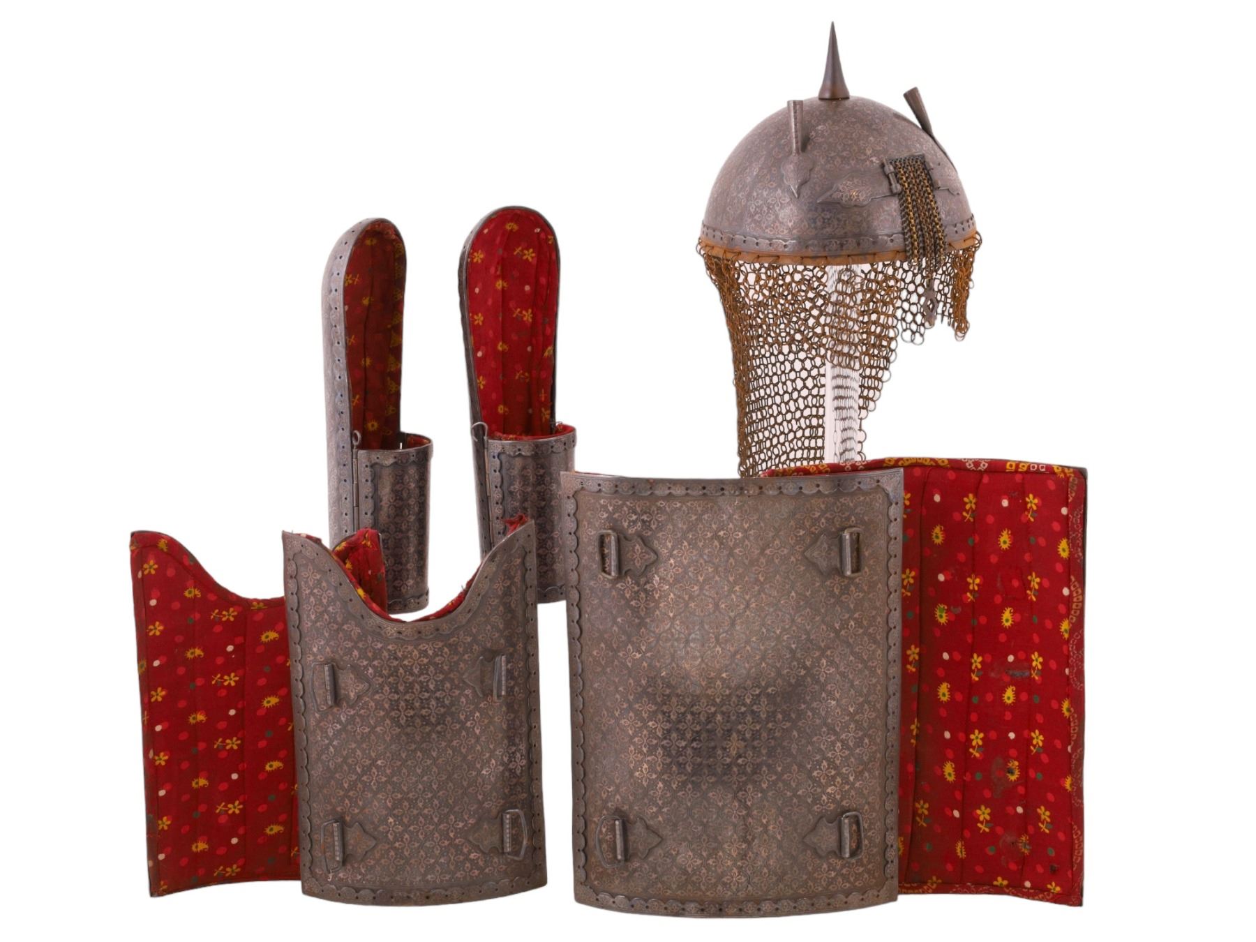 A FULL SET OF INDIAN CHAR-AINA ARMOR HELMET, TWO BAZUBANDS