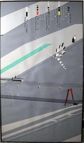 A FUTURISTIC THREE PART SILKSCREEN PRINT OF AERIAL VIEWS.