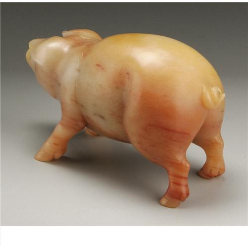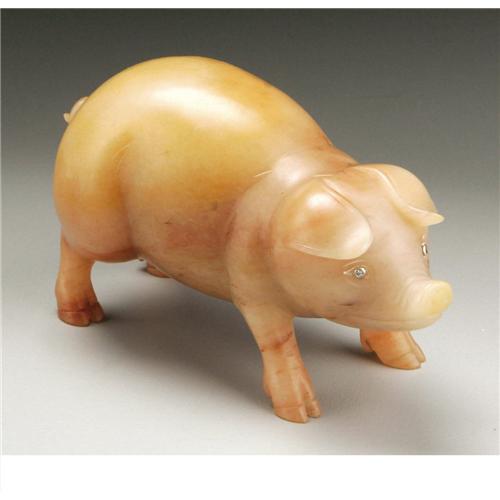 <B>A Russian Carved Hardstone Figure Of A Pig</B></I><BR><BR>Attributed to Karl Faberge, St. Petersburg, Russia<BR>Early Twentieth Century<BR>Hardstone/chalcedony and diamond<BR>4 in. long<BR><BR>A whimsical, carved chalcedony figure of a standing pig, with a corkscrew tail and ears flopping forward towards the bezel inset diamond eyes<BR><BR>Provenance:<BR> Walsh Family Art Trust