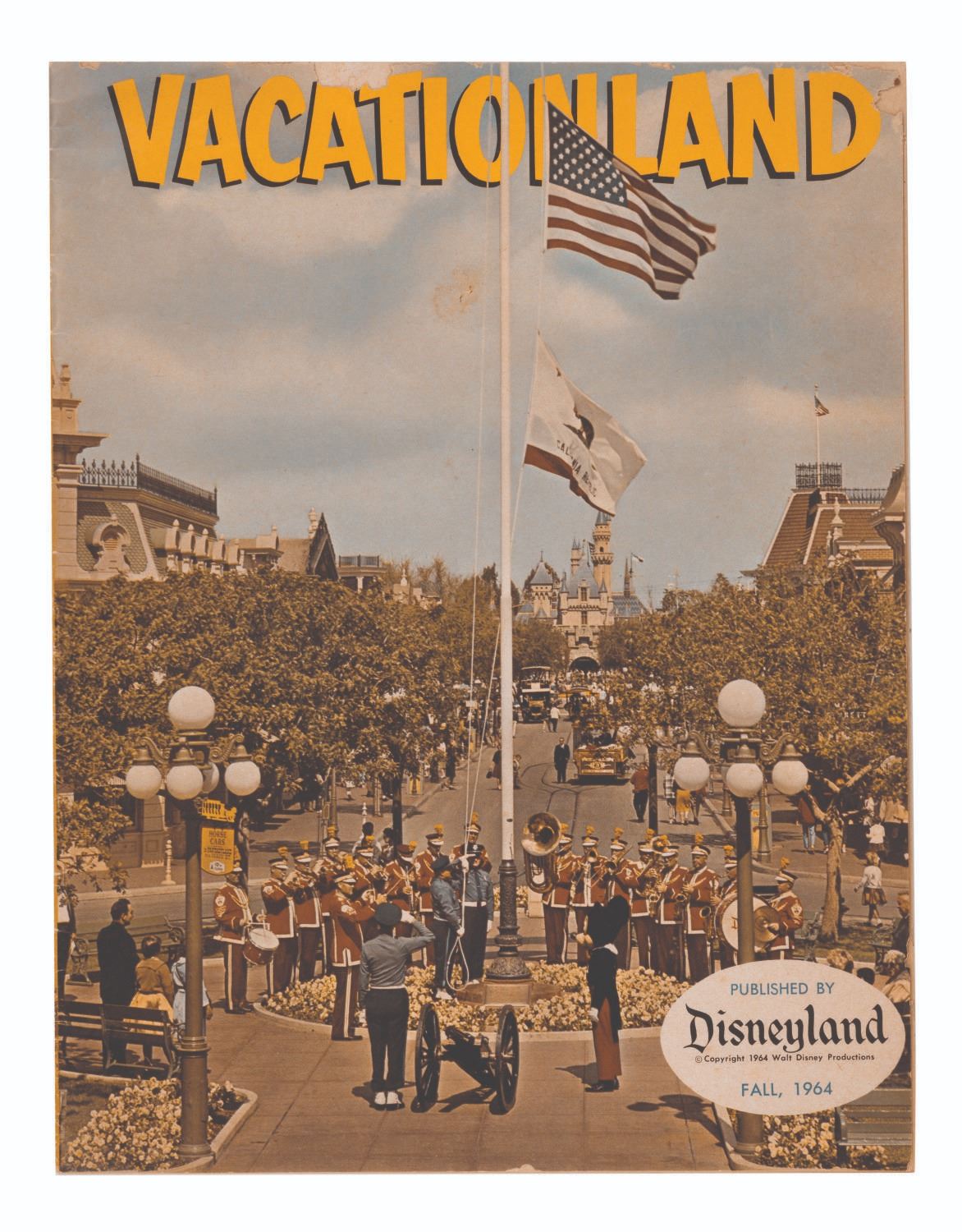 (Disneyland, 1964) A Fall 1964 copy of Vacationland magazine published by Disneyland. Articles and advertisements inside include other Southern California Attractions including Knott's Berry Farm and Marineland of the Pacific. Measuring 8.25"x10.75", the magazine is in good condition, with light wear from age and handling, and small chipping to edges of the front cover.